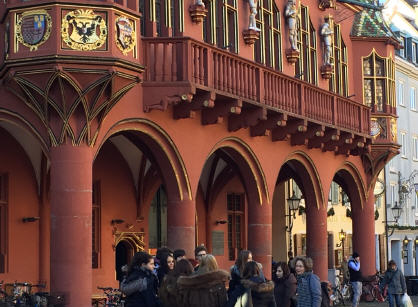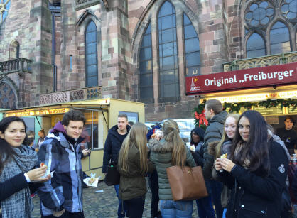 Nachdem alle wieder bei Kräften waren hieß es bei herrlichem Sonnenschein und lauen 12 Grad die Freiburger Innenstadt entlang der „Bächle“ zu erkunden. Trotz frühlingshaftem Wetter war dann aber doch noch ein Abstecher auf den gemütlichen Weihnachtsmarkt krönender Abschluss unserer Exkursion und willkommene Gelegenheit uns für die Rückreise mit Crêpes, Flammkuchen, Schokofrüchten und Plätzchen zu stärken.