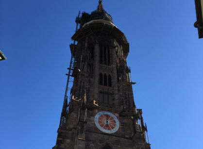 Als Erstes wurde mit einem Blick aus der Ferne auf das Münster – dem „Herz der Stadt“ – begonnen. Unverkennbar für das Stadtbild Freiburgs ist der 116 Meter hohe Turm, der lange Zeit der höchste Kirchenturm Europas war. Im Dialog erarbeiteten Schüler gemeinsam mit den Führern die zahlreichen Besonderheiten des Münsters. Reichhaltiger Figurenschmuck ziert das Äußere und vor allem die Vielfalt der Dekorationen aus rotem Sandstein versetzen den Betrachter ins Staunen.