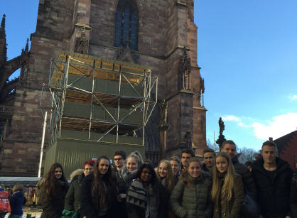 An einem außergewöhnlich freundlichen Mittwoch im Dezember machte sich der Katholische Religionskurs der J2b auf den Weg nach Freiburg, um das Münster in seiner ganzen Pracht hautnah erleben zu können. Die Hinfahrt verlief staufrei und anlässlich eines Geburtstages sangen die Schüler bereits im Bus kräftig und freuten sich auf den bevorstehenden Tag.