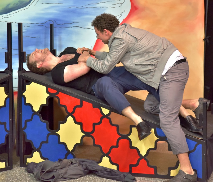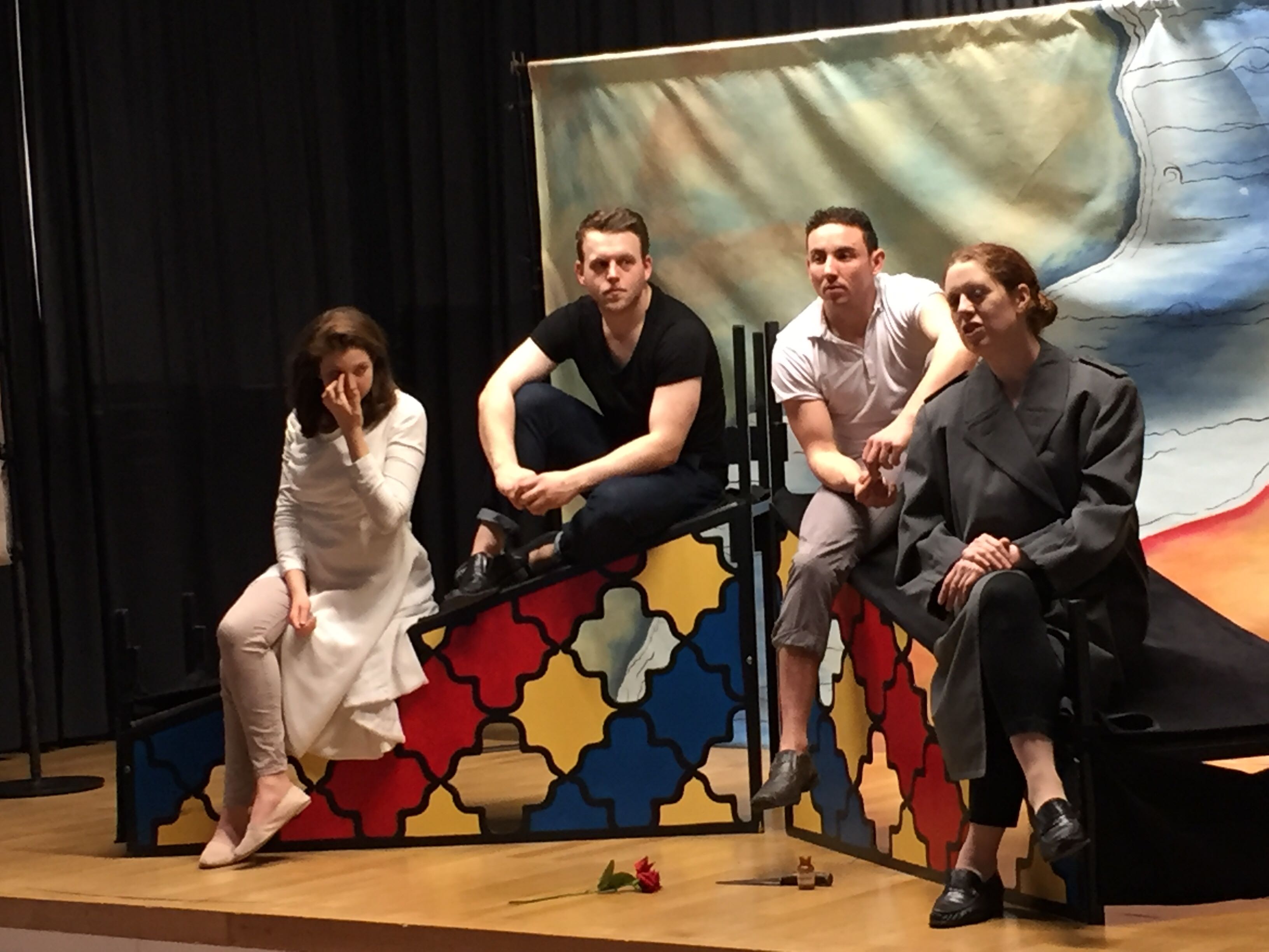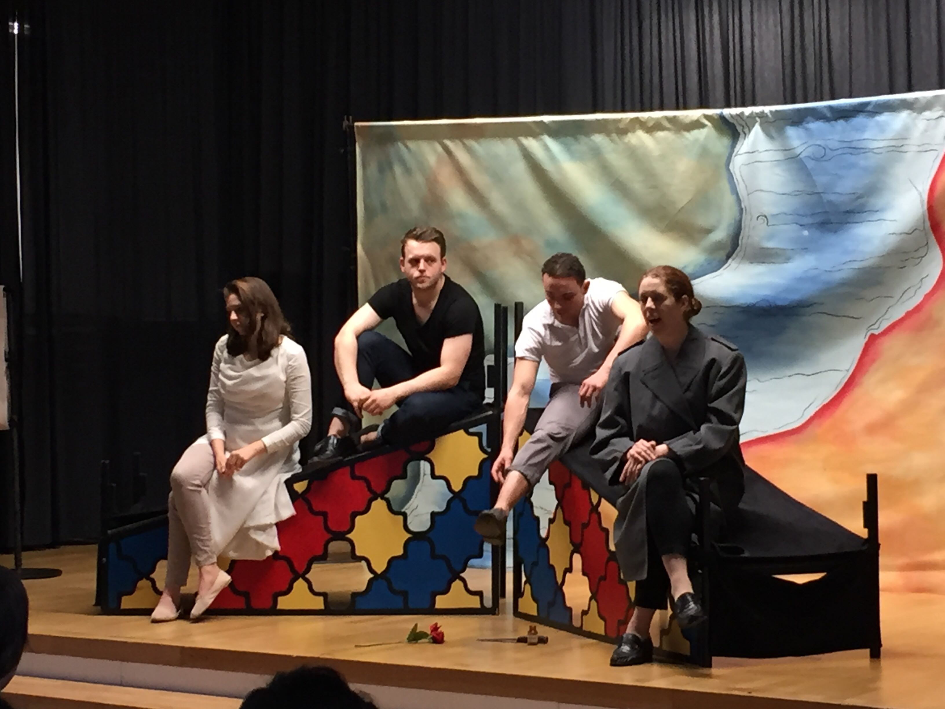 Die je zwei jungen Männer und Frauen schafften es vor einer recht schlichten aber wirkkräftigen Kulisse – die nach links und rechts abfallende Rampe diente mal als Tisch, mal als Grab und mal als Balkon – das Stück lebendig werden zu lassen.