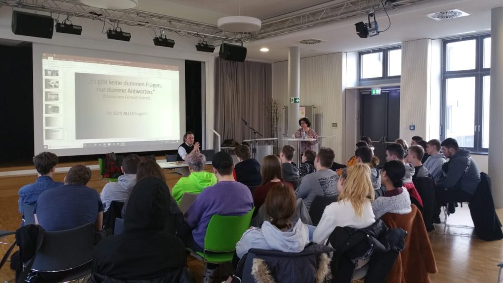 Im Rahmen der ehrenamtlichen, bundesweiten Initiative „Rent a Jew“ waren zwei jüdische Mitbürger aus der jüdischen Gemeinde Mannheim am Montag, den 02.März 2020, an der Handelslehranstalt Bruchsal zu Gast, um Vorurteile abzubauen, die Demokratie zu fördern und den interkulturellen Austausch zu stärken. Zunächst hielten die beiden Refereten Orna Marhöfer und Benno Salz einen Vortrag über jüdisches Leben in Deutschland sowie jüdische Traditionen und Feste. Untermalt wurde der Vortrag mit Familienbildern und Familiengeschichten. Anschließend fanden ein Austausch und eine Diskussion der Referenten mit den Schülerinnen und Schülern der Berufsfachschule Wirtschaft im ersten Jahr statt. Dies wurde zuvor im GGK-Unterricht vorbereitet. Themen waren hier allgemeine Fragen zum Judentum und dem Alltag von Juden in Deutschland, aber auch Antisemitismus und Rassismus. Marhöfer und Salz ermunterten die Schülerinnen und Schüler dazu, mit offenen Augen durchs Leben zu gehen, zu hinterfragen, sich zu engagieren und „mit den Menschen offen umzugehen“. Sie betonten, dass Ausgrenzung sich immer allgemein gegen Minderheiten richte und somit gegen die Gesellschaft an sich.  Die Schülerinnen und Schüler waren interessiert und stellten viele Fragen. Die HLA bedankt sich für eine gelungene Veranstaltung, die dem Judentum ein Gesicht gibt, einen bleibenden Eindruck hinterlässt und Empathiebildung ermöglicht.