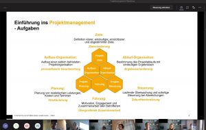 Die Schülerinnen und Schüler bekamen zuerst einen Einblick in ein weltweit führendes Softwareunternehmen. Nach einer Einführung, welche Projekte die SAP managet, wurde den Kursteilnehmerinnen und -teilnehmer anhand des Wasserfallmodells erklärt, wie man diese erfolgreich durchführt und welche Fallstricke es dabei gibt. Dabei durften die Schülerinnen und Schüler selbst aktiv werden, indem sie ihre schulischen oder privaten Projekte unter dem Blickwinkel dieses professionellen Ansatzes betrachteten. Aufgelockert wurde das ganze durch interaktive Präsentationen und ein Kahoot-Quiz. Zum Schluss wurde noch das Vorgehensmodell Scrum, mit dem bei der SAP die Softwareprojekte umgesetzt werden, vorgestellt.