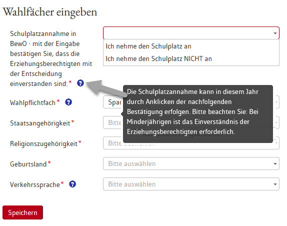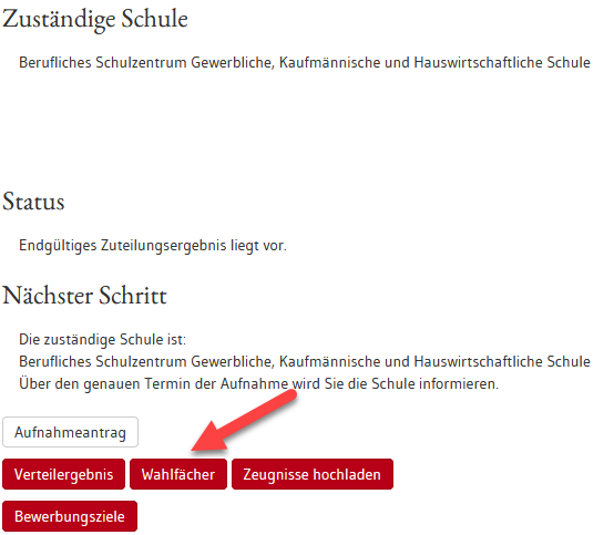 Außerdem wird am 29.07. das sog. Wahlfachmodul freigeschaltet, mit dem die Schulplatzannahme zusätzlich online möglich ist. Dafür bitte auf der Übersichtsseite auf den Button „Wahlfächer“ klicken. Nähere Informationen hierzu findest du im Bewerberleitfaden unter „Schritt 8: In Falle einer Zusage: Schüleraufnahme an der aufnehmenden Schule“.
