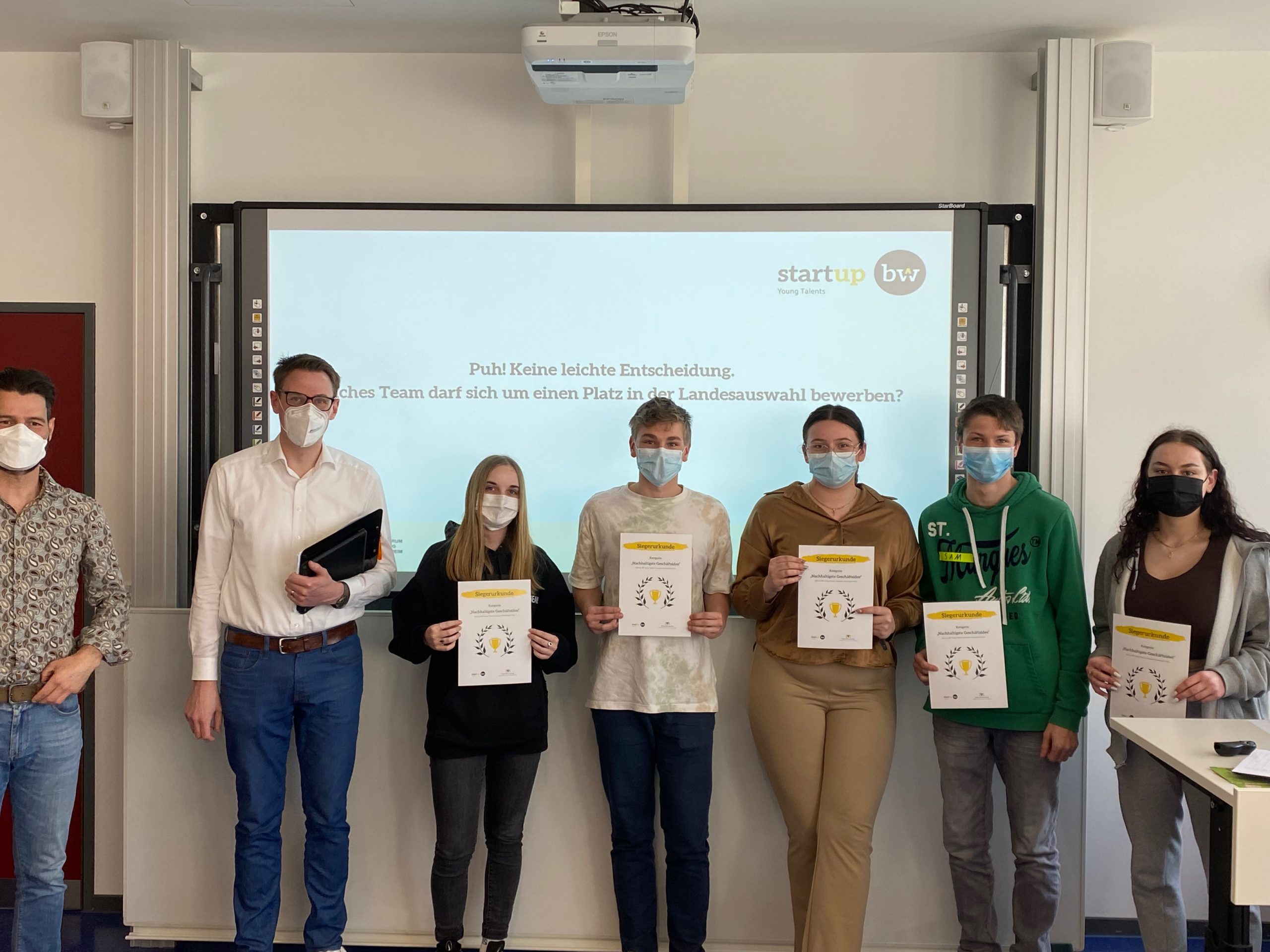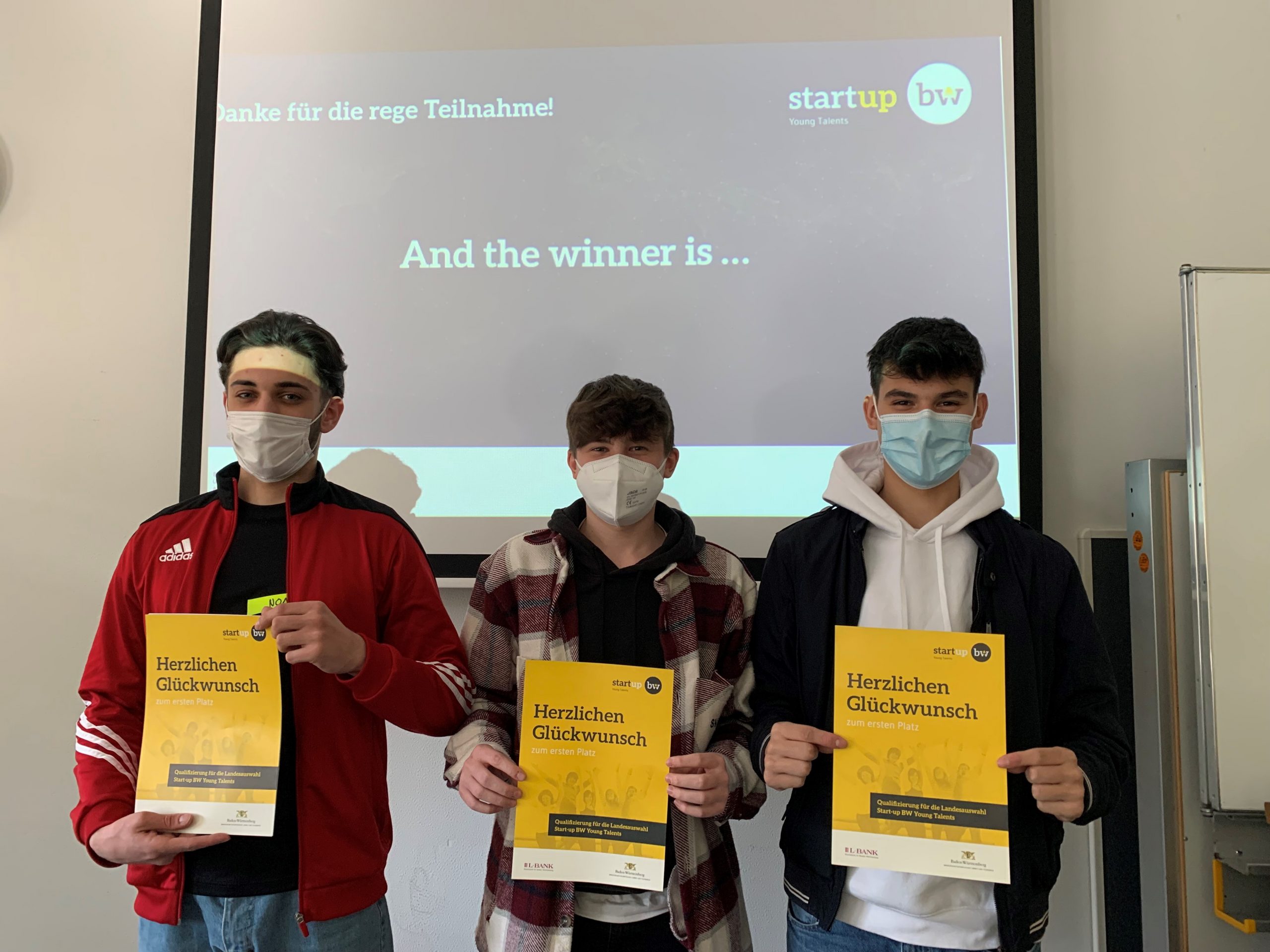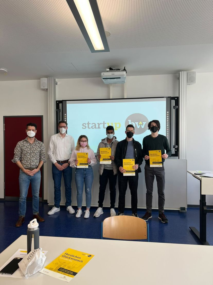 Die ersten Plätze sicherten sich die Teams „MyJob“ mit ihrer Idee einer Jobsuch-App speziell für Schüler:innen sowie „MFH-App“, mit einem Hundehalsband mit Vitalfunktionskotrolle. Auch das Team „urSpot“ mit der Idee einer Parkplatzsuch-App erhält als weiterer Gewinner die Chance, sich für einen Platz in der Landesauswahl Start-up BW Young Talents zu bewerben.
