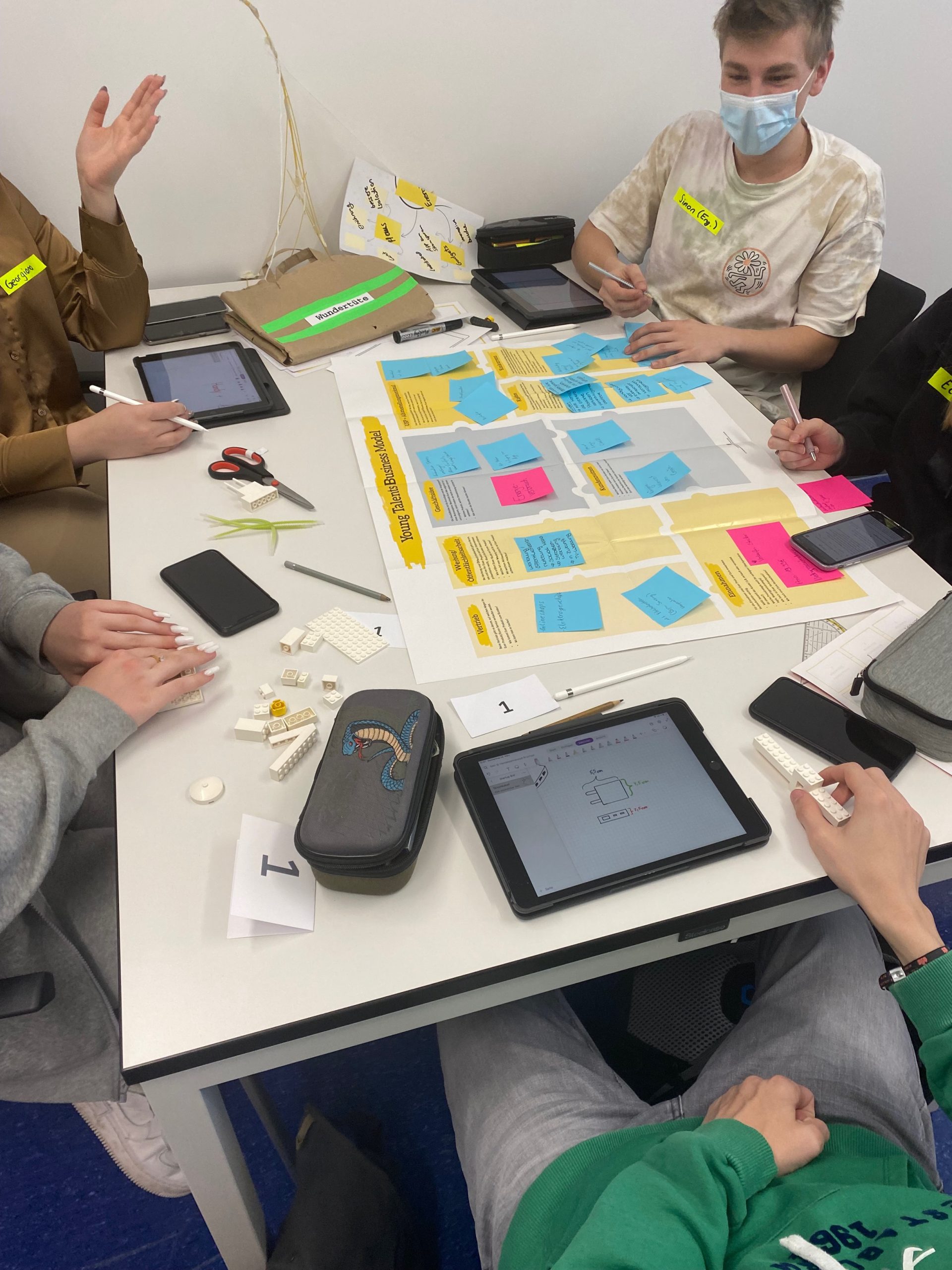 Im Rahmen eines eintägigen Innovation-Workshops durchlebten die Schülerinnen und Schüler die ersten Phasen einer Unternehmensgründung: Kreative Lösungswege für die vorab identifizierten Probleme finden, daraus eine Geschäftsidee ableiten, Konzeption des Geschäftsmodells und Präsentation im Elevator-Pitch-Format vor einer fachkundigen Jury.