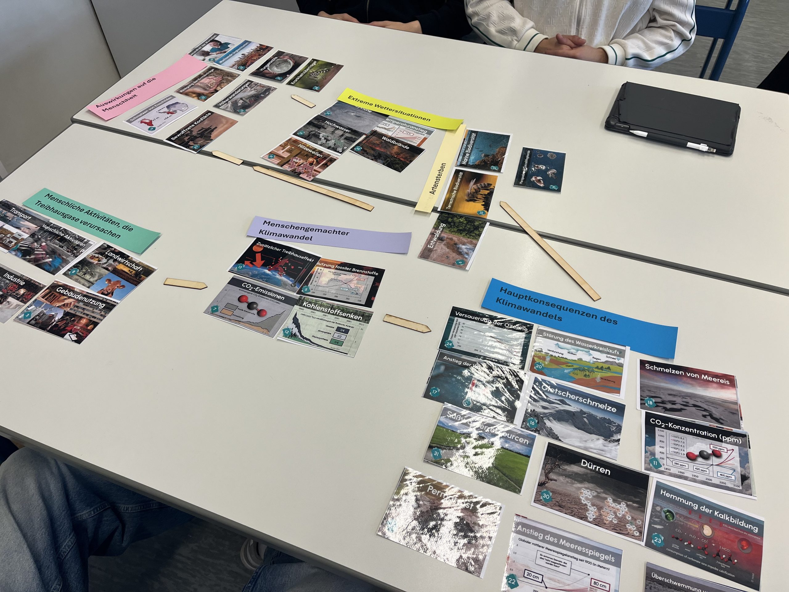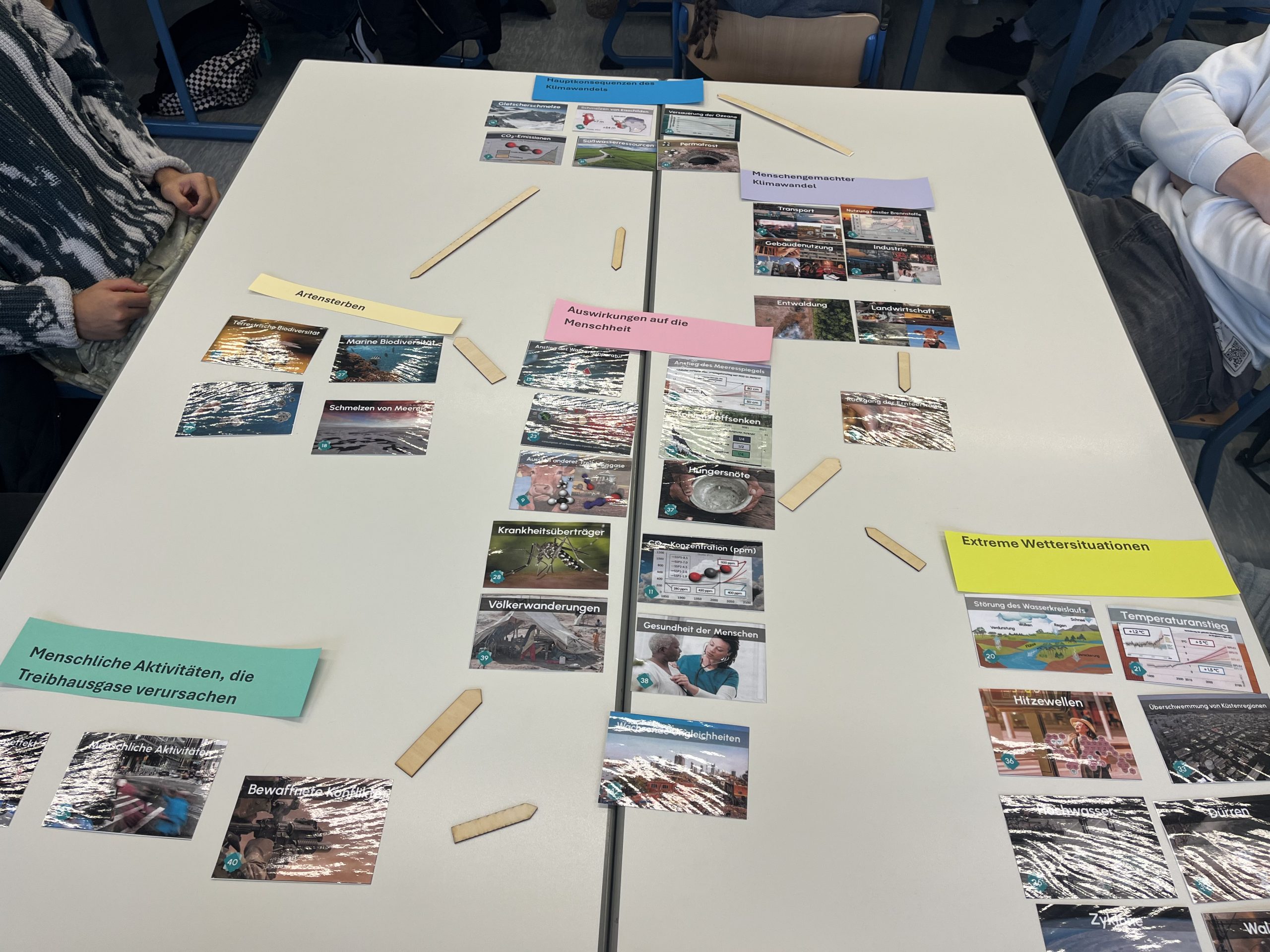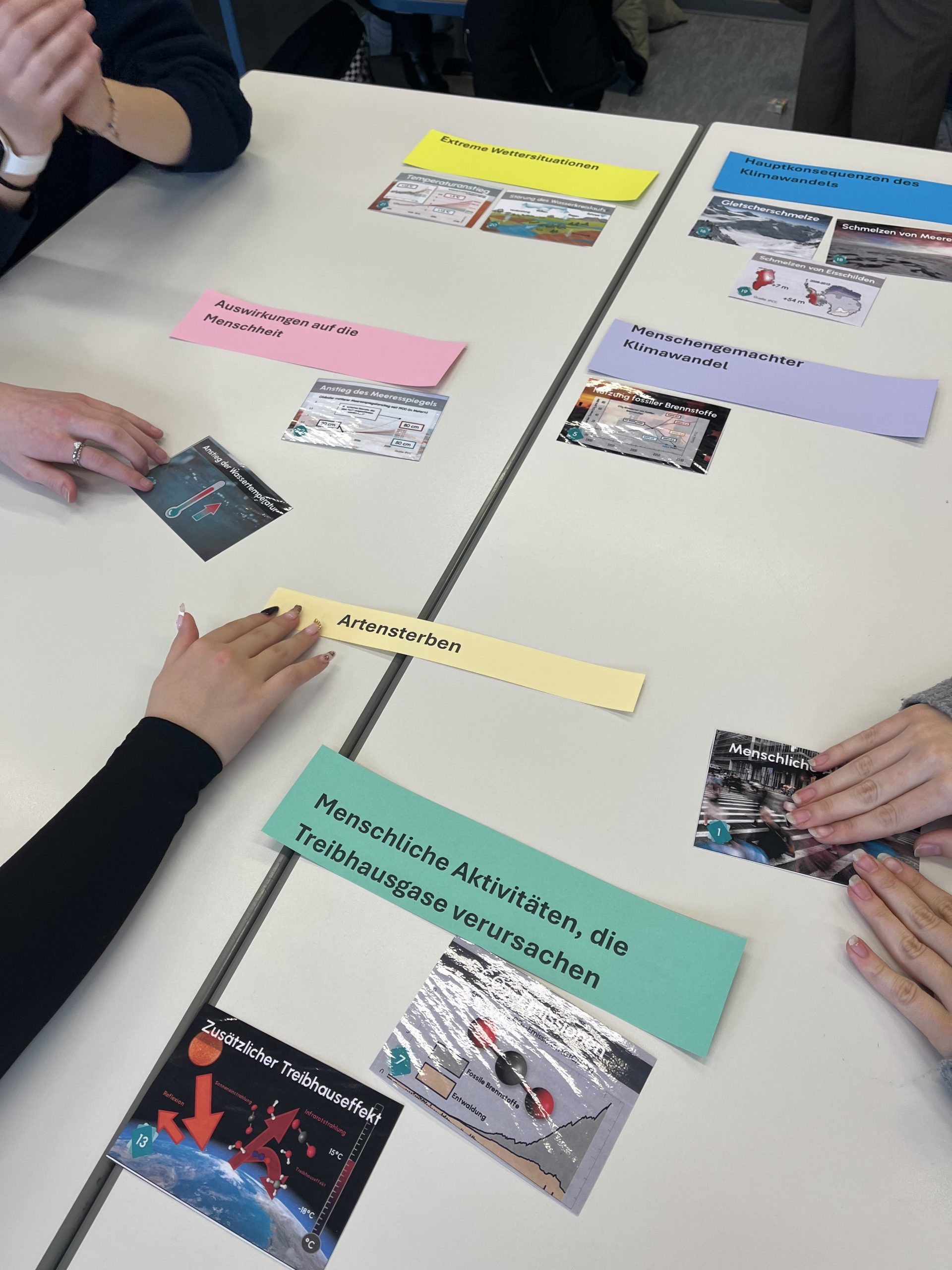 In Kleingruppen setzten die Jugendlichen zunächst Karten mit statistischen Daten, Schlüsselbegriffen und kurzen Erläuterungen zueinander in Beziehung. Schritt für Schritt entstand so ein individuelles Gesamtbild, das wie ein Puzzle immer weiter anwuchs und die komplexen Zusammenhänge greifbar machte. Besonders bereichernd war der anschließende Gruppenwechsel: Die neuen Teams erklärten sich gegenseitig ihre zuvor gelegten Klimapuzzles, knüpften Verbindungen zwischen ihren Überlegungen und vertieften das gemeinsame Verständnis.