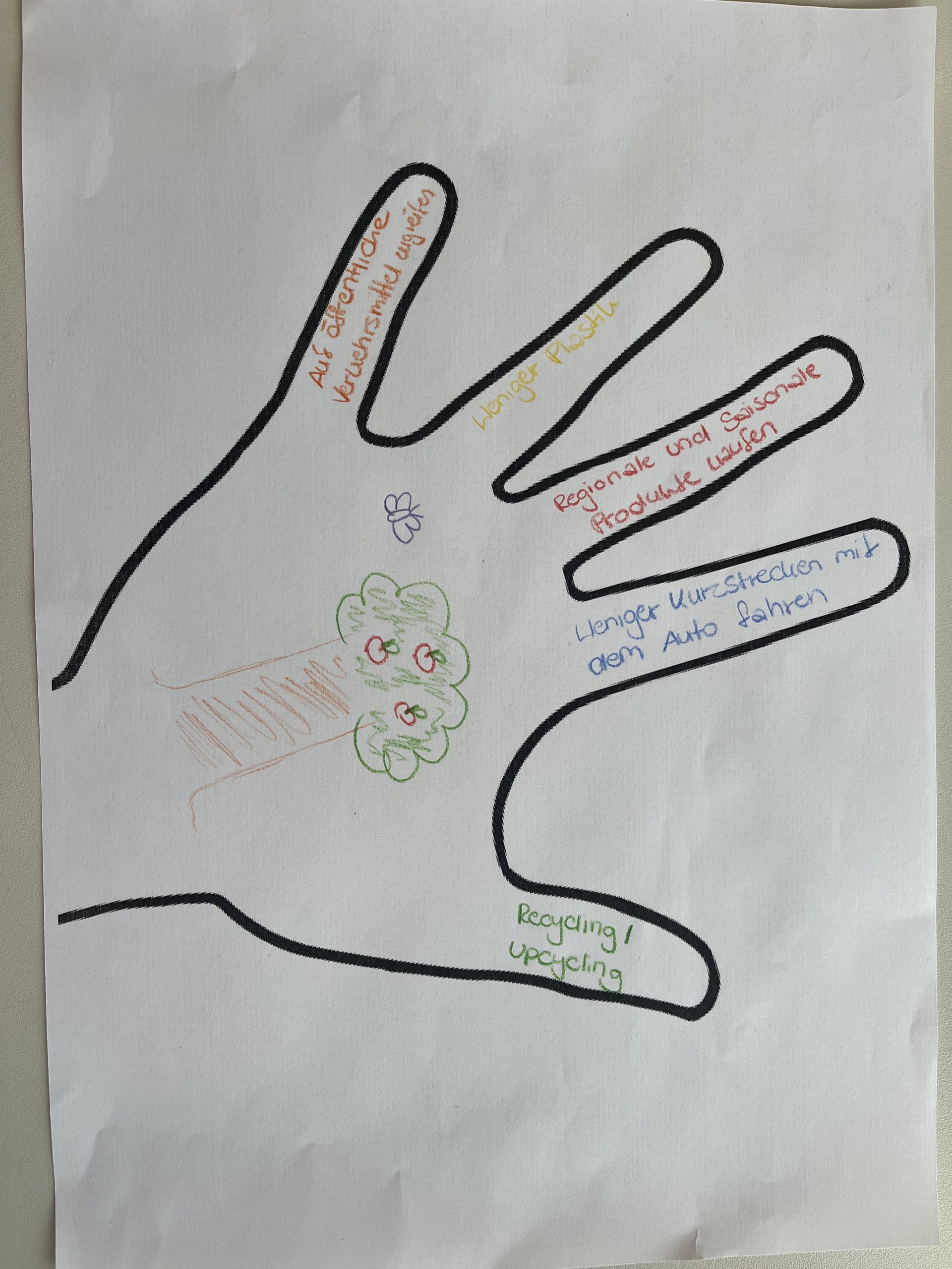 Zum Abschluss durften die Schülerinnen und Schüler in einem symbolischen Handabdruck festhalten, wie sie persönlich zum Klimaschutz beitragen möchten. Sie formulierten fünf konkrete Aktivitäten, mit denen sie selbst zur Abschwächung des Klimawandels beitragen wollen – ein motivierendes und hoffnungsstiftendes Ergebnis eines rundum gelungenen Workshops.