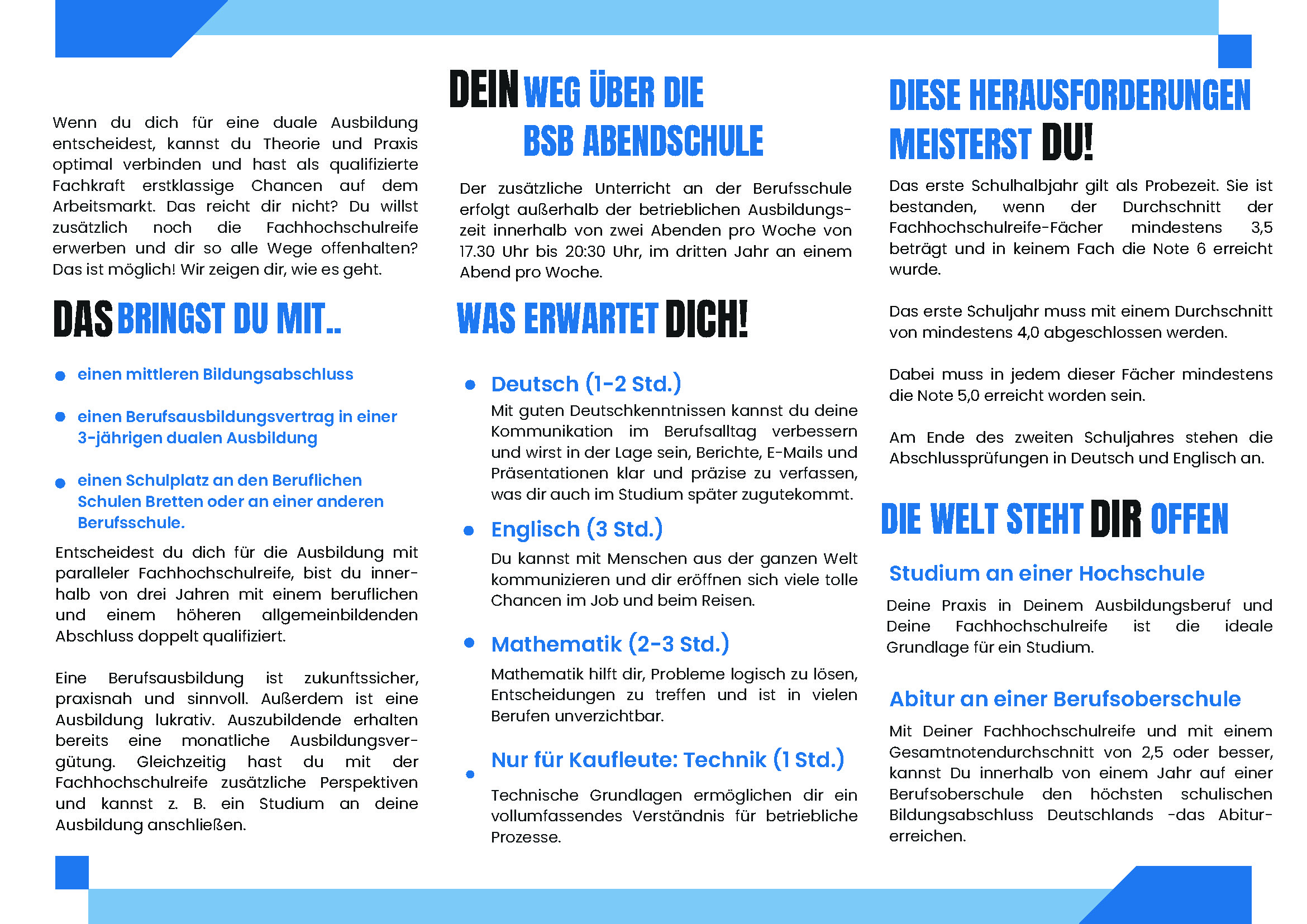 Alles Wichtige sowie die Anmeldemöglichkeiten finden Sie hier: http://bsb-zq.de/kurse/ausbildung-fachhochschulreife/